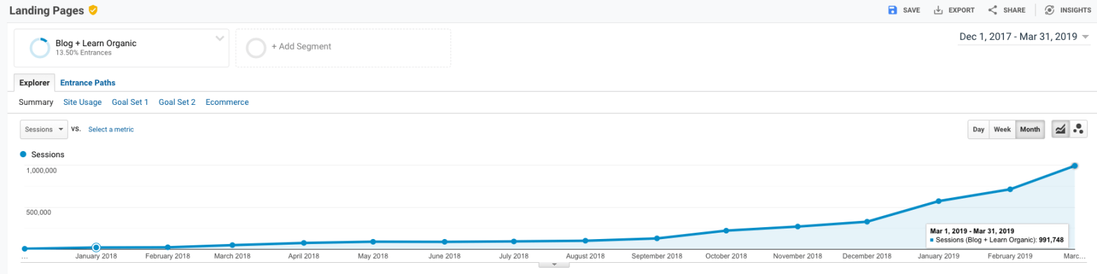 For more than two years, we invested heavily in building out blog content with little direct effect on organic traffic. For the first nine months of 2017, our monthly blog organic traffic ranged from 3,000 to 5,000 sessions. In December 2017, we had 6,800 organic visitors. In March 2018, there were 50,381 organic sessions to our blog.